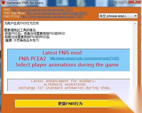 比如你装了一个劈腿跳跃动作mod,不用他更新的话进入游戏轻则动作不变,重则摆大字跳出,所以你如果安装的mod含有动作,就必须安装这个,安装后他会在DatatoolsGenerateFNIS_for_Users目录下,打开后默认是英文,点一下下按菜单,调成中文,如图