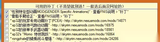 底下的可选补丁根据你装的mod不同是不一样的你只需要点击一下“更新FNIS 行为“等他完成后就可以了,有时候会提示一个警告,