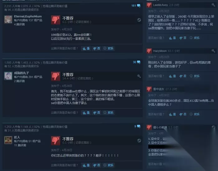 对比该游戏在Steam其它区域的价格会发现,本作在国区售价与美区基本持平(60美元,约合人民币414元)。而游戏在港区和韩区的售价,均低于Steam国区。 目前,游戏官方还未对此事件作出回应。有玩家称,Square Enix这次的吃相实在不太好看,如果官方不对此给出一个明确说法,即使游戏之后降回199元他们也不会购买。 如转载涉及版权等问题,请作者与我司联系,我司将在第一时间删除或支付稿酬。