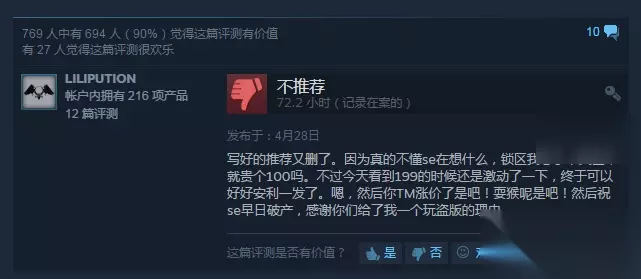 商店评价中,玩家对本作的游戏素质还是给予了肯定。不过,他们还是为游戏打了差评。