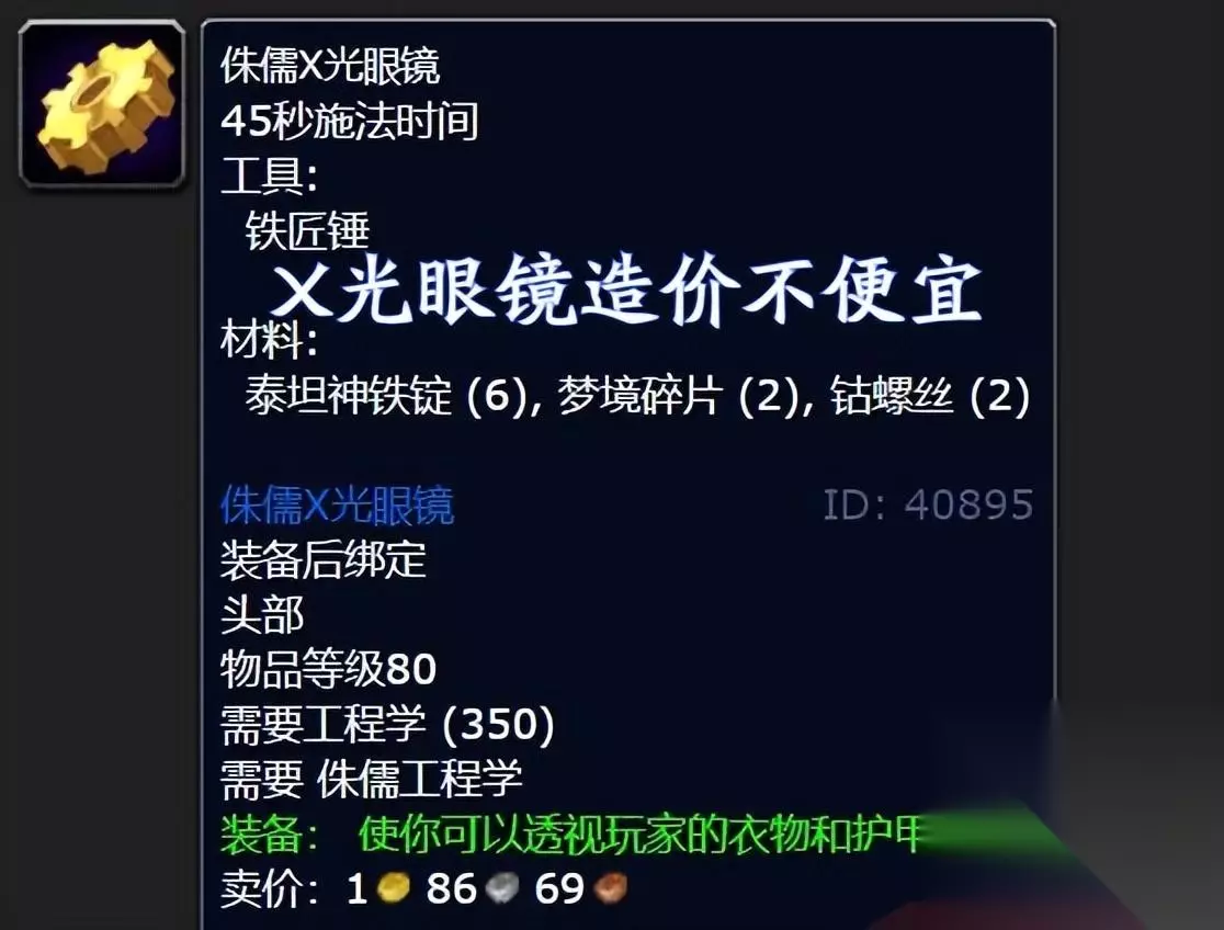 为什么到了WLK版本还要学工程学呢?除了各种实用的道具之外,最重要的是项目里有趣的装备——矮人X光眼太好玩了,就像绿字里的描述一样:它可以让你看穿玩家的衣服和盔甲。这眼睛真能看透,只要玩家戴上它,所有的小伙伴都会变成裸奔的。