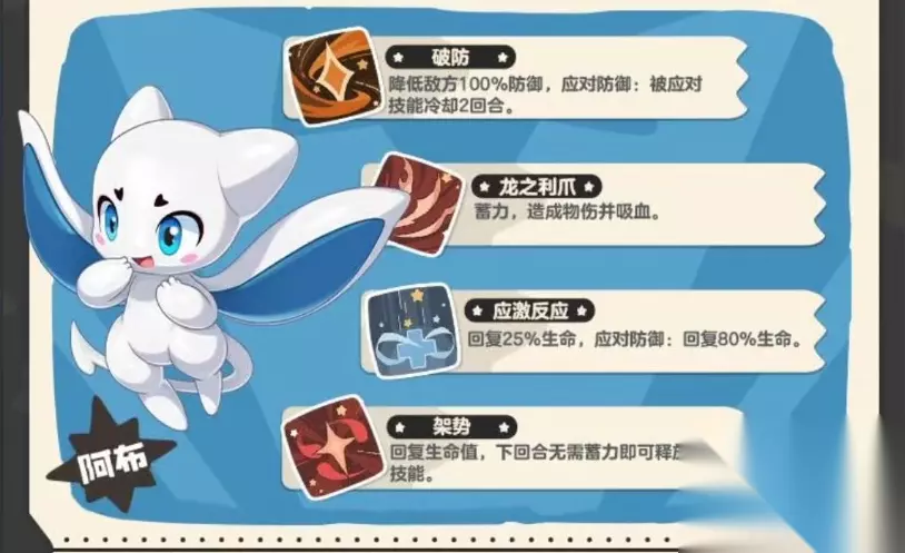 四个技能各有分工,架势管节奏和血量,龙之利爪负责持续输出,龙威专门对付龙系目标,借用补上临场应变的空缺。整体逻辑很清晰,不复杂,但实际操作需要根据对局情况判断技能顺序,不能无脑按。 阿布的强度不在于某一项数据特别突出,而是各方面都够用,还有借用这个灵活的机制兜底。熟悉这套打法之后,它在各种场景里的出场率都会很高,是那种养了不会后悔的精灵。