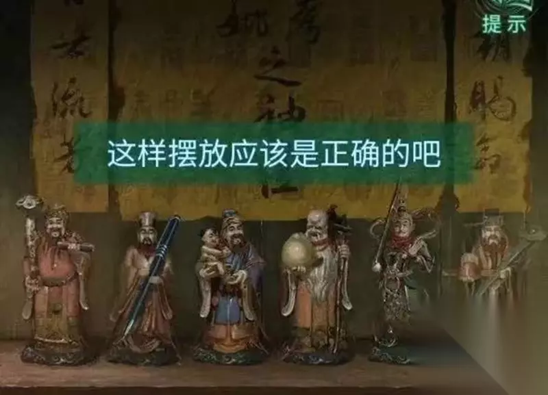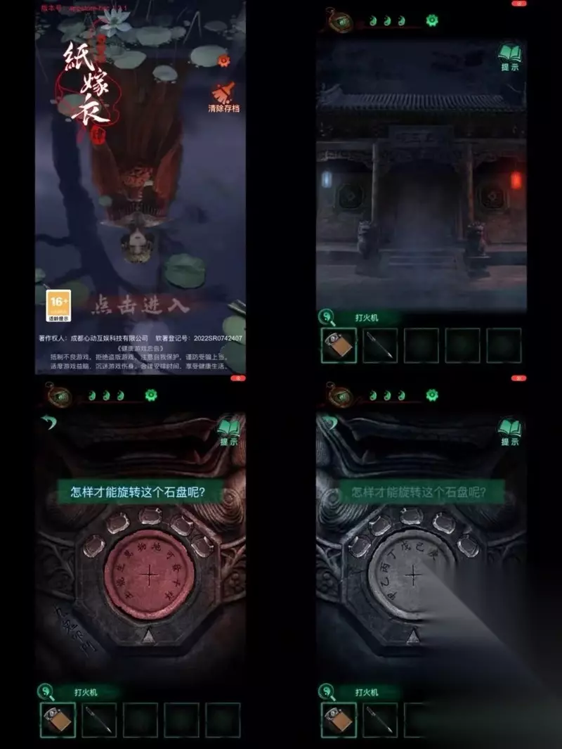 第四章疑鬼在房间角落找到毛笔,扭转瓷器获得钥匙。院子里的线索关联桌上解密,取得象棋后与石敢当对弈获得黑白棋子。古董室放置棋子取得罗盘,走廊使用罗盘观察指针方向,风水室外用打火机消灭纸人获得万花筒。