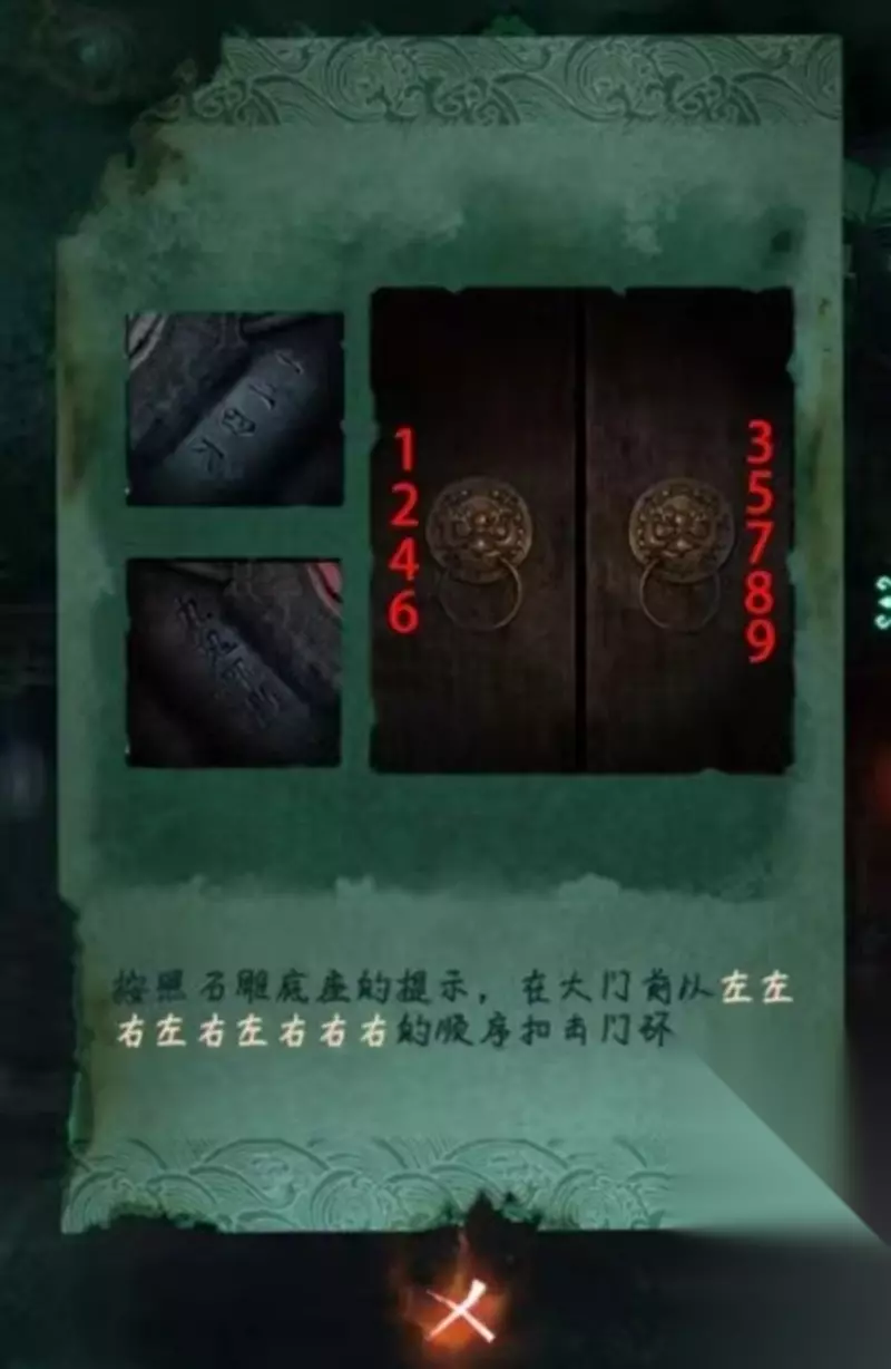 第三章交错要先点燃两侧蜡烛,按左左右、左右左、右右右顺序敲门环。庭院中点亮灯笼后寻找花轿里的化妆盒,假山处按正确顺序点击获得三叉戟。调整拨号盘外壳位置取得钥匙,拼凑人形图案后从报纸找偏旁线索,右下石狮子处有第二把钥匙。