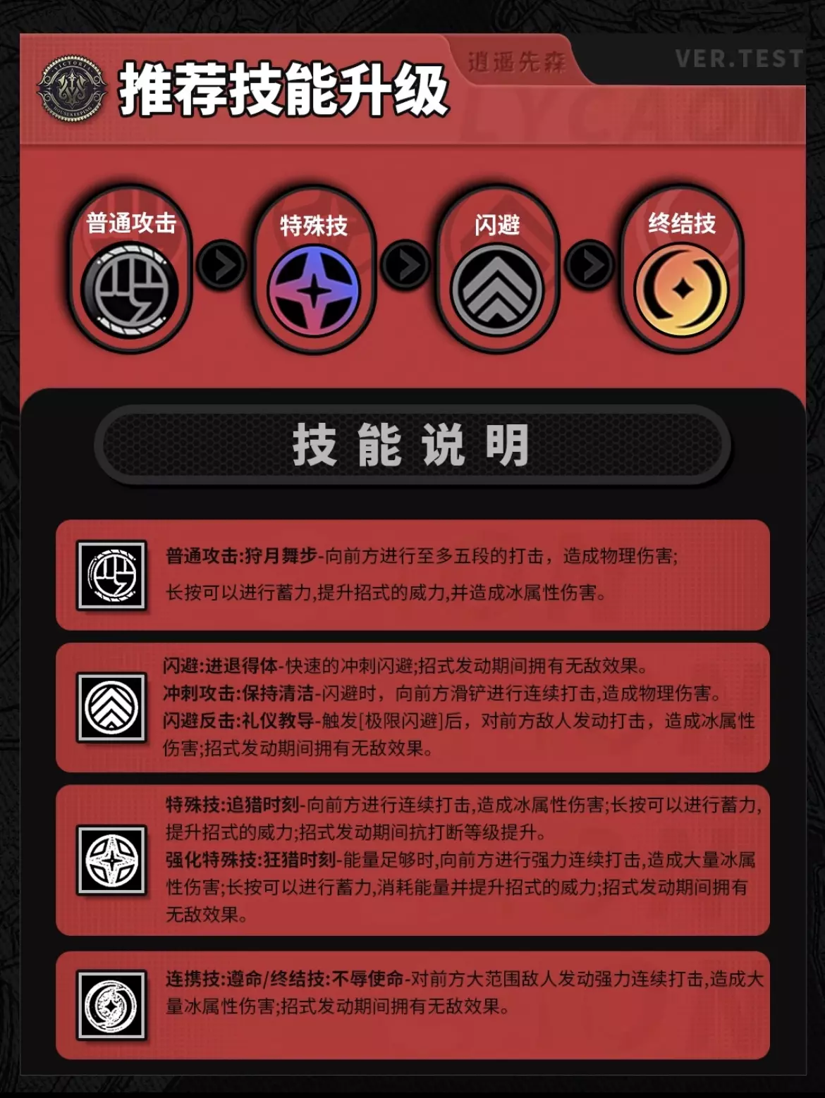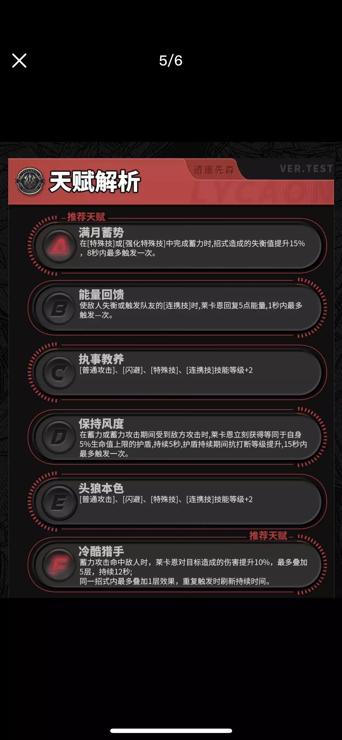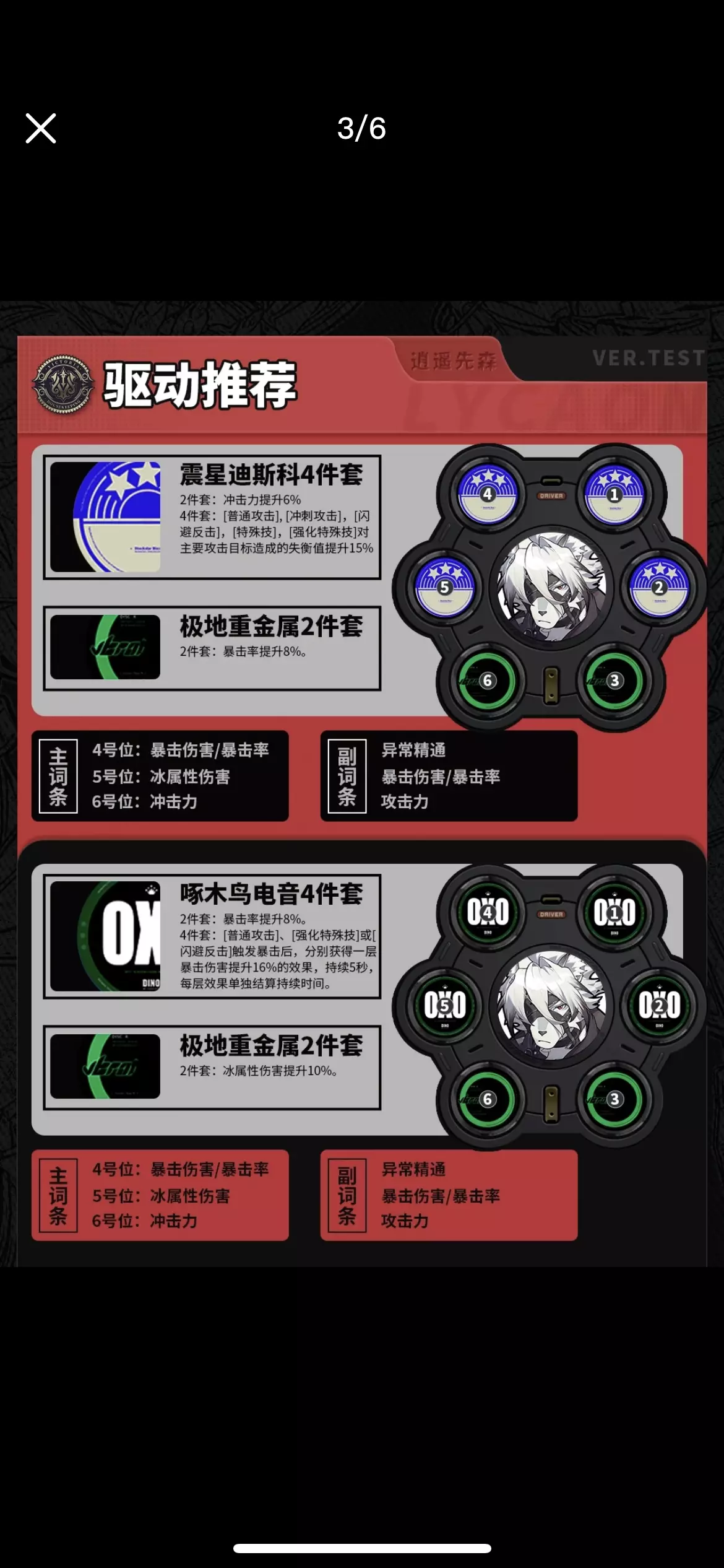 今天给大伙带来狼叔冯-莱卡恩的角色攻略 角色特点:快速失衡/冻结站场 职业/属性﹣击破/冰属性 推荐行迹升级顺序:普攻>特殊技>闪避>终结技 关键天赋提升: 【天赋1/天赋6】 天赋1:提升失衡值 天赋6:蓄力攻击时可增伤最多50 音擎推荐:拘束者 驱动推荐:极地重金属+啄木鸟电音 配队:与苍角鲨鱼妹组成纯色冰队 或者担任队伍击破手 #绝区零 #绝区零喧响测试 #绝区零攻略 #莱卡恩