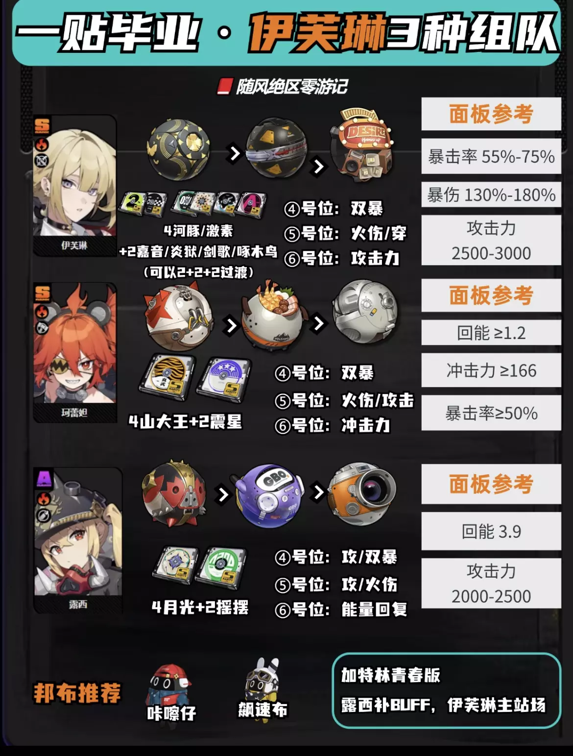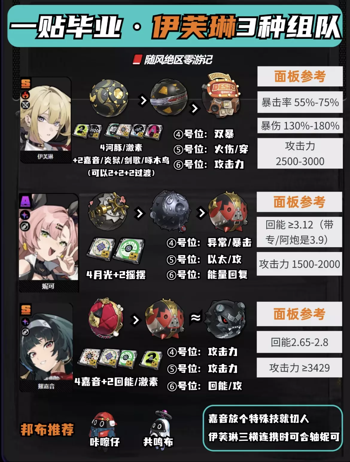 大家早上中午晚上好,我是随风 今天给大家带来的是伊芙琳3种组队的一图流攻略 对于伊芙琳来说,相比莱特她更需要耀嘉音,没有莱特可以用妮可替代,强度也很高 如果两个都没有,加特林还有青春低配版,社长+露西,也算是可以用的 #绝区零 #绝区零创作者激励计划 #绝区零攻略 #绝区零伊芙琳