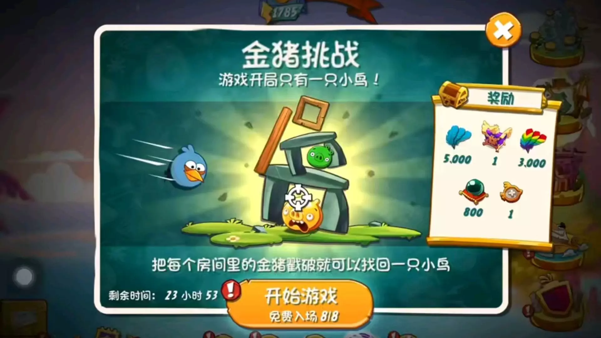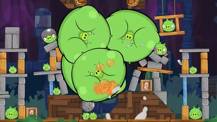 这是《愤怒的小鸟》的趣味关卡内容,该关卡出现大量小鸟,玩家操控小鸟攻击绿猪的建筑,过程中获得高额分数,呈现了愤怒的小鸟游戏里极具看点的闯关场景。