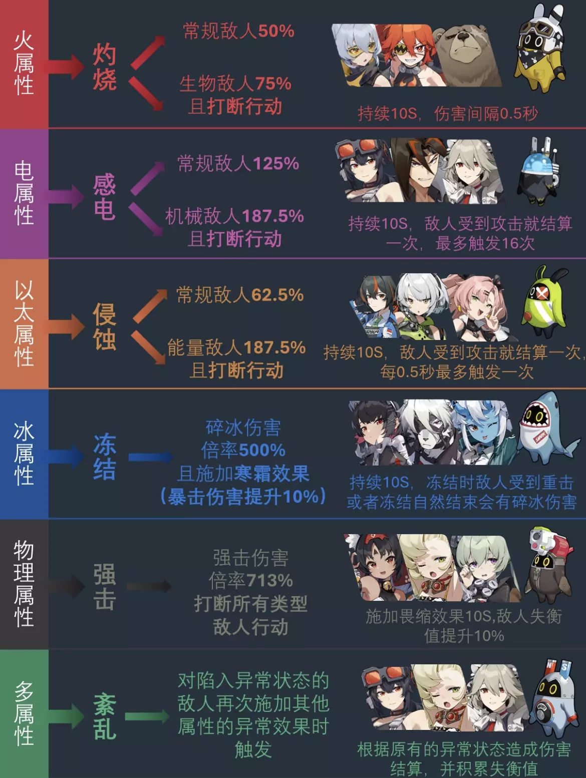 在绝区零里面,不同属性伤害在积累到一定程度后会造成不同效果。 而不同效果会对不同的敌人有着不同的伤害加成。 比如,长得像人的生物敌人,更容易受到火烧的影响, 白祇重工那些咣当咣当的机械敌人,更容易受到电属性的影响, 而以太属性这种一看就没法理解的,就适合打比较抽象的以太生物。 而冰属性加冻结和暴伤,物理属性加失衡和打断,各个反应混在一起异常,就是紊乱。 根据不同的敌人,选择不同的攻击方式,能够得到更好的效果。 当然,目前还是可以先捡自己手上有的角色,对照表格,练出两个队,在前期都是够用的。 #绝区零 #绝区零攻略 #绝区零创作者激励计划 #艾莲 #艾莲乔 #绝区零朱鸢 #莱卡恩 #11号 #猫宫又奈