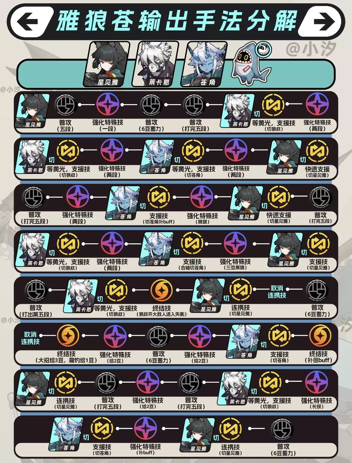 省流版:打一套清小怪,之后狼叔,苍角轮流给buff,buff叠满之后二蓄一大直接拿下 普攻(五段),强化特殊技(一段),普攻(6豆蓄力),普攻(打完五段),等黄光,支援技(切狼叔),强化特殊技(两段),等黄光,支援技(切苍角),强化特殊技(两段),快速支援(切星见雅),普攻(打完第五段),强化特殊技(两段),支援技(切苍角补buff),强化特殊技(展旗),支援技(切星见雅),普攻(打出第五段),等黄光,支援技(狼叔),强化特殊技(两段),支援技(合轴切苍角),强化特殊技(三豆展旗),支援技(切星见雅),普攻(打出第五段),等黄光,支援技(切狼叔),终结技(狼叔开大敌人进入失衡),连携技(切星见雅),取消连携技,普攻(6豆蓄力),取消连携技,终结技(大招给3豆,霜灼给1豆),强化特殊技(给2豆),普攻(6豆蓄力),强化特殊技(给2豆),支援技(切苍角),终结技(补回buff),支援技(切星见雅),普攻(打完第五段),强化特殊技(一段),普攻(继续打完第五段),等黄光,支援技(切狼叔),强化特殊技(长按),支援技(切苍角),强化特殊技(补buff),支援技(切星见雅),普攻(6豆蓄力)#绝区零 #绝区零创作者激励计划 #绝区零归零计划 #绝区零攻略 #绝区零雅 #雅狼苍 #云霞同归处