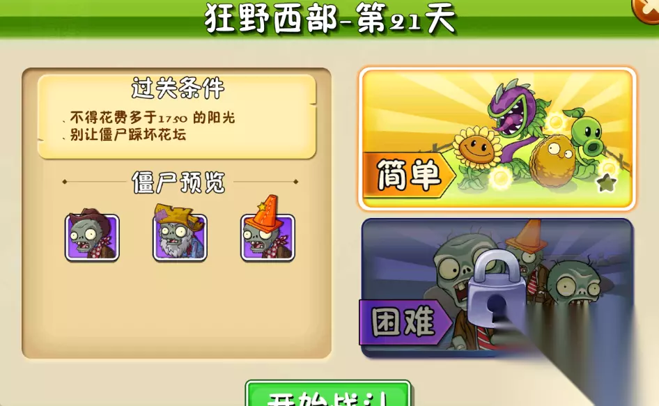 植物大战僵尸2植物大战僵尸狂野西部-第21关简单模式攻略如下: 通关条件和僵尸类型