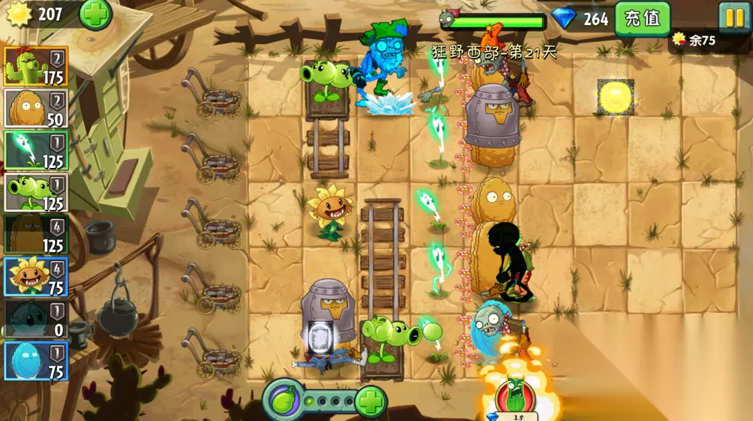 游戏的开始:向日葵种植一颗就足够了,我们不需要获得太多阳光,坚果CD一好立马上场,挡在被保护植物面前,同时种植一排闪电芦苇。后期在最前面放的坚果墙基本成型,闪电芦苇阵容也差不多,就可以种植双向投手了,双向射手也可以根据淘金僵尸的上场时间进行种植,种在移动矿车里面,也就够用了。ps:一定要注意阳光的使用,不要超过关卡使用数量。