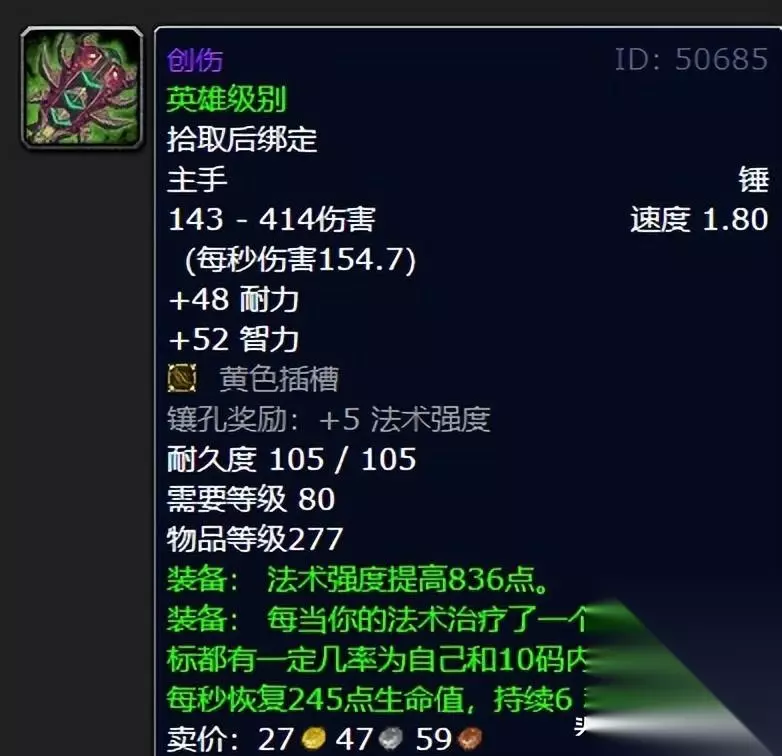 创伤加48耐力、52智力,外加一个黄色插槽,法术强度提高836点,特效是每当你治疗了一个目标,该目标有几率为自己和10码内的同伴每秒恢复245点生命值,持续6秒。不得不说,创伤的特效简直是神一样的团刷技能,相当于免费获得一个团体治疗,甚至要比德鲁伊的野性成长还要强大。