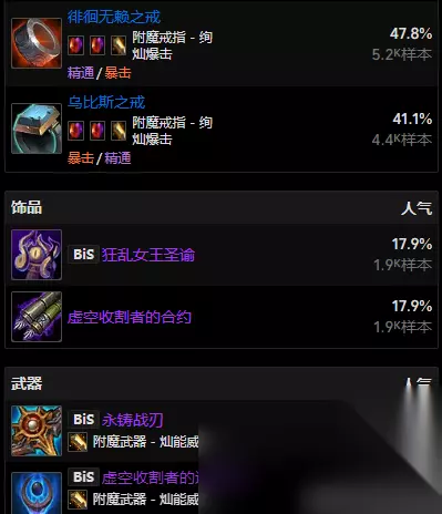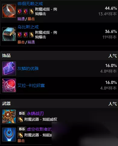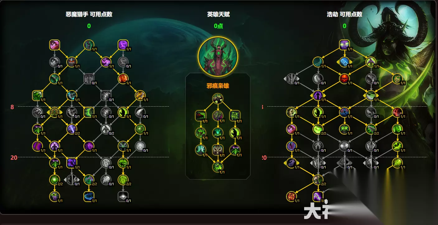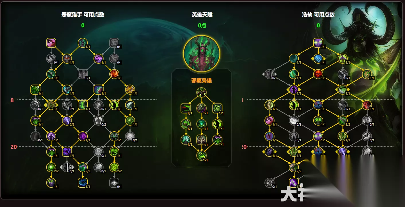 魔兽世界的11.0版本已经过去了一段时间了,就在最近更新了11.0.5版本,本次版本更新上线了许多内容有不少对职业的改动,还有不同的配置手法,那么下面就给大家带来魔兽世界11.0.5浩劫dh玩法攻略。 魔兽世界11.0.5浩劫dh玩法攻略 专精:浩劫 推荐种族: 血精灵 >暗夜精灵>其他 属性优先级: 大秘境:敏捷>暴击(16088)>精通(14211)>急速(4311)>全能(1514) 团本:敏捷>暴击(16896)>精通(14928)>急速(4300)>全能(1421) 消耗品: 合剂:炼金混沌合剂 药水:淬火药水、阿加治疗药水 食物:午夜舞会盛宴 武器:镔爪磨刀石、镔爪平衡石 英雄天赋 大秘境:邪痕枭雄!
