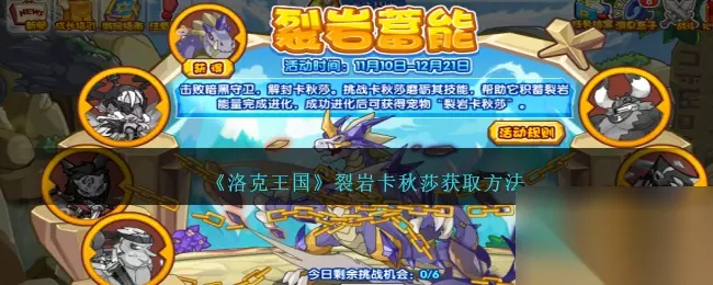 摇滚王国破解卡秋莎可在新推出的破解能量活动中获得。击败黑暗守卫并解锁喀秋莎。挑战喀秋莎,磨练它的技能,帮助它积累碎石能量,完成进化。进化成功后可以获得宠物“裂岩喀秋莎”。以下是233乐园小编为您带来的《洛克王国》裂岩卡秋莎获取方法。有兴趣的朋友应该看看。