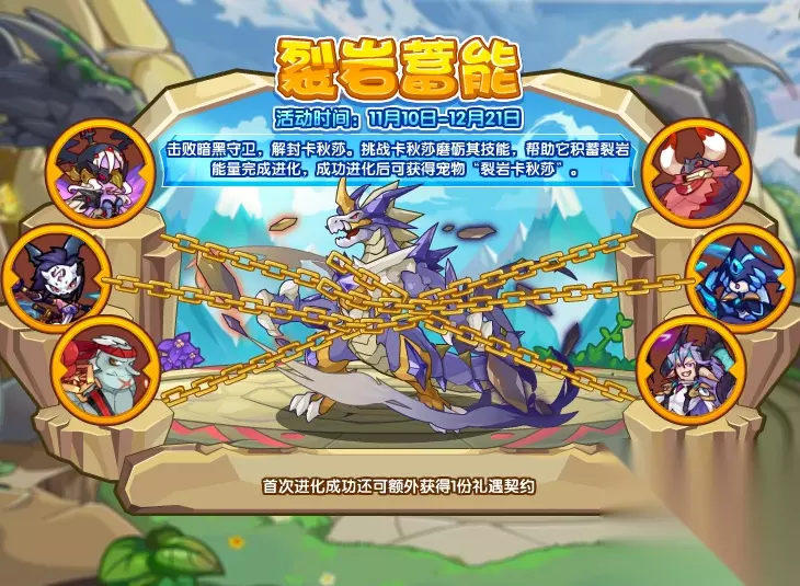 劈裂岩石储能 活动时间:11月10日-12月21日 活动地图:龙珠禁地 活动中获得:裂岩喀秋莎、礼遇契约