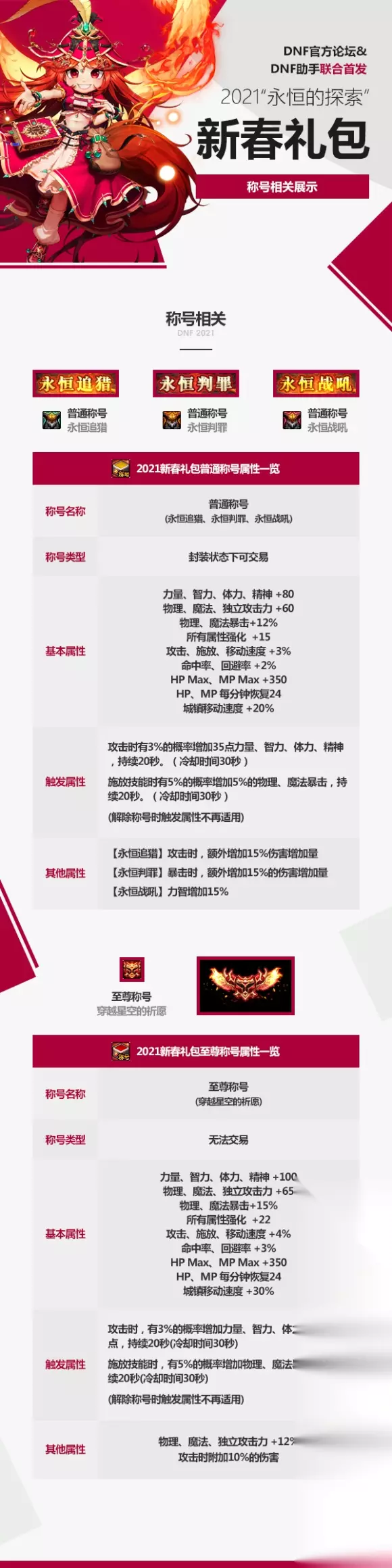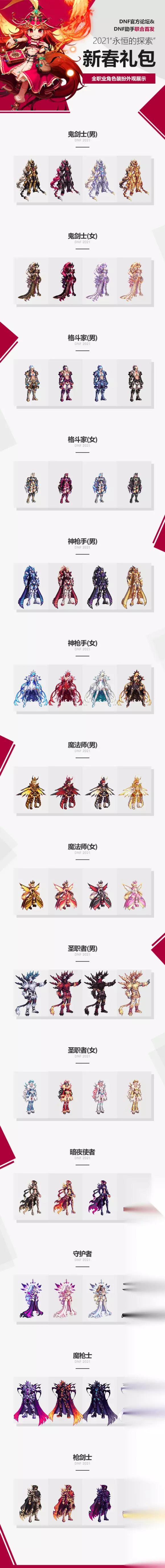 DNF2021年新春礼包有什么?在DNF的游戏中,2021年的新春礼包已经曝光,这次的内容非常丰富,不少玩家都在期待新春礼包的上线,接下来小编就为大家带来DNF2021永恒的探索新春礼包详情一览吧。 DNF2021新年套一览 一、角色装扮 二、至尊与武器装扮 三、称号相关 四、宠物相关 五、光环与宝珠 六、多买多送一览 七、特别宝物礼盒 八、艾尼克斯的羽毛与权能 九、礼包内容一览