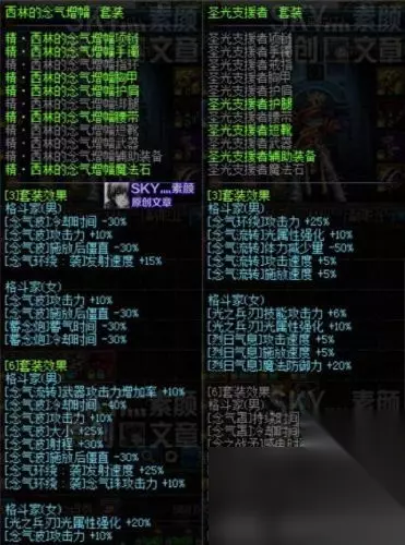 首先西林[6]可使念气流转的武器攻击力增加率+10%,对任何阶段的男气功玩家来说,都是必须要有的一套装备。而圣光[3]可使念气流转的光属性强化+10%,同时可增加5%的攻速和施放,在能用宝珠、徽章把等级堆到20级的前提下,也是获得极限提升的必备装备。但对宝珠徽章相对缺乏、Buff等级还远远达不到20级的玩家来说,可以暂时先把圣光[3]换成增加Buff等级的装备,等宝珠徽章渐渐齐全之后再换回来。