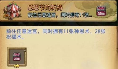 感恩节的祈祷定向越野怎么做 感恩节的祈祷: 前往任意迷宫,同时拥有11张神恩术、28张祝福术。 奖励:伊甸加速器30m 本次感恩节定向越野一共有6个任务。小编会一一为大家带来具体攻略的哦! 以上就是小编为大家带来的关于不思议迷宫感恩节的祈祷定向越野分享啦!