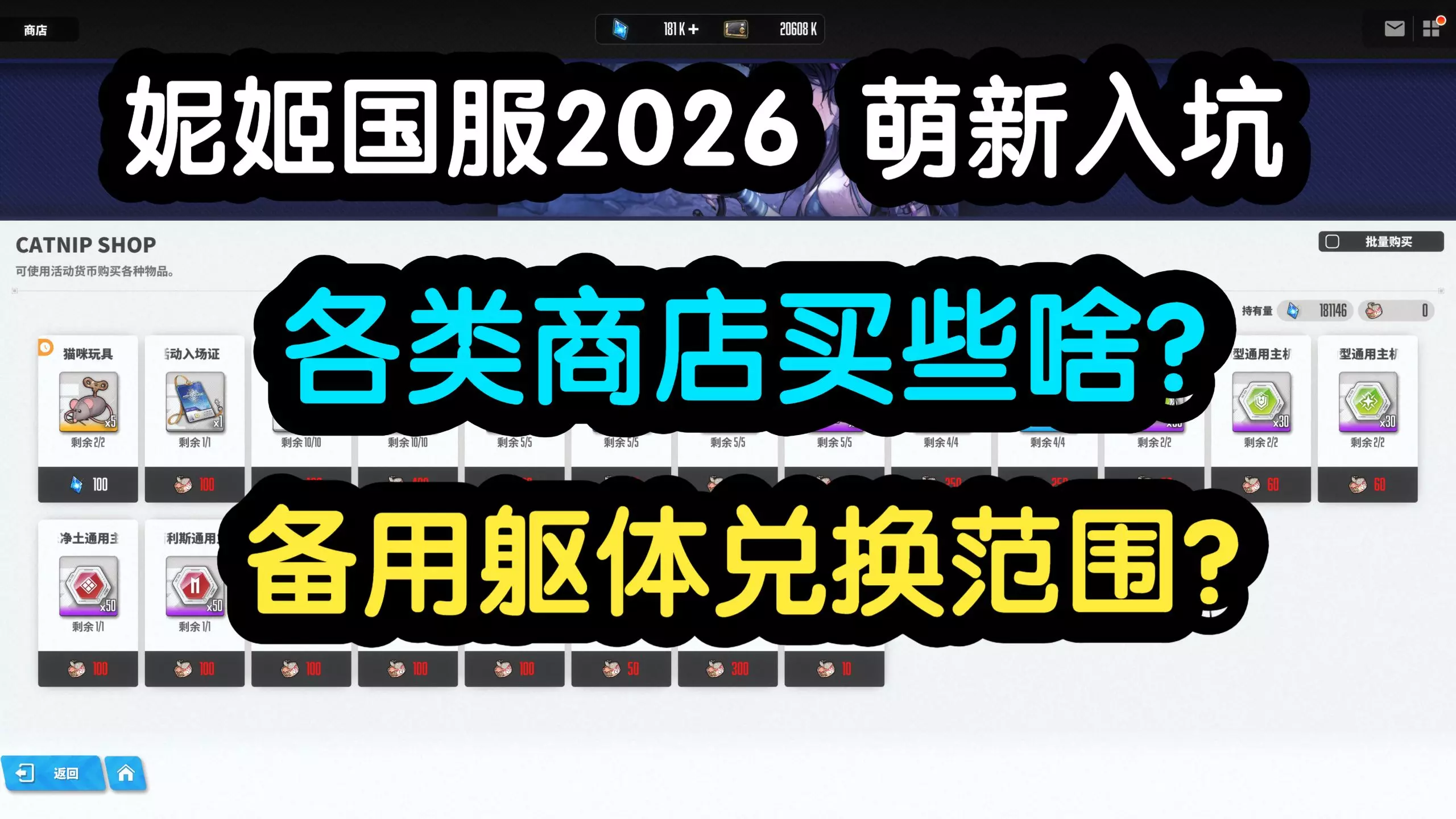 本期是2026年妮姬国服的萌新入坑攻略第2期,主要讲各类商店的代币获取方法、商店道具的兑换建议。 包括了普通商店、联盟商店、躯体标签商店、竞技场商店、积分商店、…