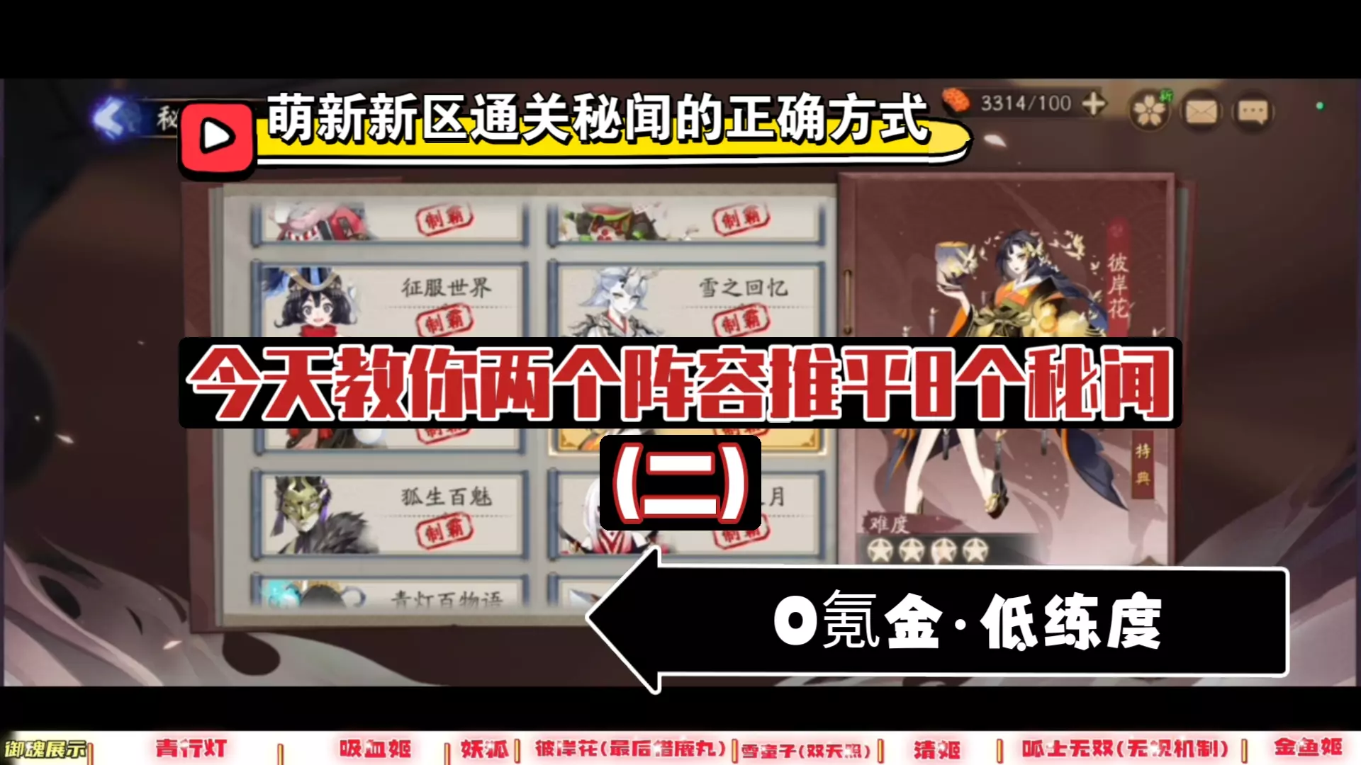 本期视频通关秘闻有:【青行灯,吸血姬,妖狐,彼岸花,清姬,雪童子,呱士无双,金鱼姬】 这几张秘闻难度不高,通过新区简单的养成和借用就可以轻松通关! 需要注意的地…