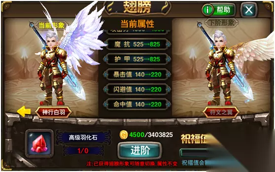 四、终级——翅膀 英雄之刃拥有一款酷炫的功能-翅膀,当玩家12级时就可以解锁翅膀功能,翅膀不仅拥有着华丽的外表,而且对玩家的战力有着极大的提升,玩家每提升一阶翅膀的外观就会改变,翅膀的属性也会随之提高,对于翅膀的升阶,道具也是必不可少的。翅膀的升阶需要羽化石,而翅膀的等阶不同,需求的羽化石的品质也不同,羽化石的获取可以通过商城、寻宝或者竞技场来获得,使用羽化石来进阶翅膀是有概率失败的,但是别担心,每次翅膀进阶失败后都会积蓄祝福值,祝福值也会增加成功率的,翅膀进阶成功后,祝福值也会清零。