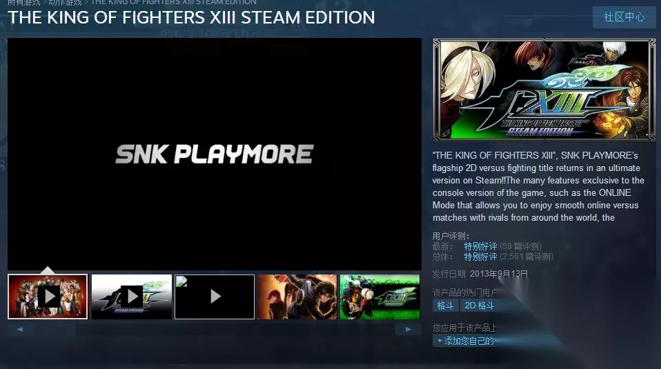 商店界面 拳皇13THE KING OF FIGHTERS XIII STEAM EDITION 《拳皇13》是由SNK PLAYMORE研发的一款FTG游戏,于2010年7月14日(街机)发行。《拳皇13》1994年8月登场的老牌2D对战格斗游戏《拳皇》系列最新作,也是接续《拳皇2003》、《拳皇XI》之后的「遥远彼之地篇」三部曲完结篇。 在经历过XII的铸造后,本作将前作的系统完全更新,导入了EX必杀技,NEO MAX2超必杀技等新系统,在手感上更接近传统拳皇系列作品,steam版本还将追加新角色"比利. 凯恩","Mr.空手道","NESTS风格京","斎祀(变身前)""取回了炎的庵"。