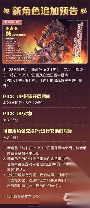 亲爱的各位骑士君: 我们预计于4月23日11:00~15:00期间对全平台进行一次停服更新维护。 维护完成后将追加全新角色★3纯(CV:川澄绫子)、实装天井功能,同时开启一系列限时活动。