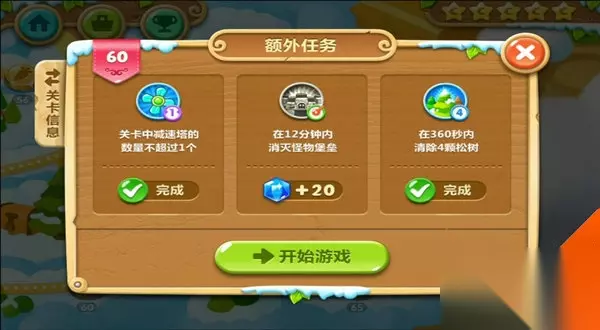 当大家玩到保卫萝卜2第60关,相信大家已经对该游戏非常熟悉了,而保卫萝卜2第60关是天空主题的第10关,那我们要怎样才能拿到金萝卜呢?下面小编就给大家带来保卫萝卜2第60关攻略,看看我们要怎样才能快速拿到保卫萝卜2第60关的金萝卜。 保卫萝卜2第60关攻略 【额外任务】 一、关卡中减速塔的数量不超过1个。 二、在12分钟内消灭怪物堡垒。 三、在360秒内消除4颗松树。