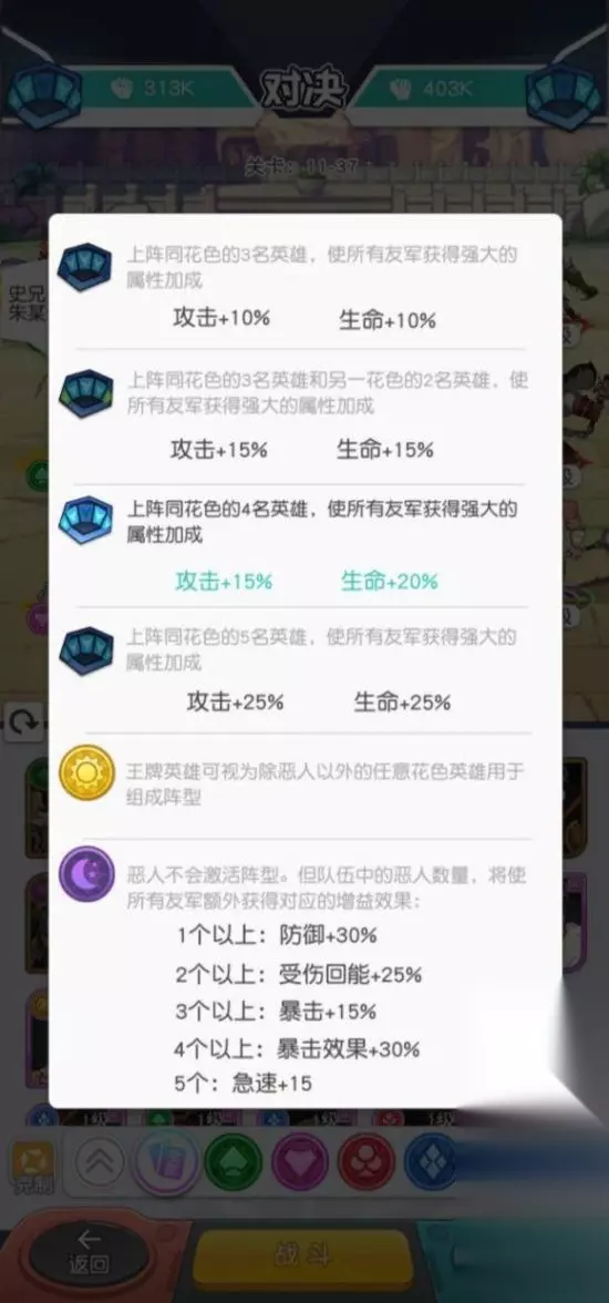 下面给大家带来的是《小浣熊百将传》新手英雄阵容推荐,针对开局注意事项及阵营选择英雄分析,做一个简单的攻略,避免新手玩家走弯路。 【太长不看】新手推荐阵容 红桃:呼延灼+史进+孙二娘+安道全+公孙胜。 黑桃:公孙+李逵+林冲+魏定国+朱武。 梅花:花荣(李俊)+郁保四+杨志+王英+白胜(公孙胜)。 方块:阮小二+三娘+燕青+戴宗+公孙胜,李应可替补。 详细攻略 按照国际惯例,游戏分PVP、PVE两个大模块。 PVP方面:游戏pvp奖励差距并不大,所以资源几乎没有差距,因此不用担心大佬排名靠前比你多很多资源,佛系一些,完全可以按单机游戏来玩。 PVE方面:与大部分放置类游戏相同(剑与远征之水浒之征),分四个基本花色,同花色有加成,而王牌英雄可以看做任何一个花色,恶人英雄则有额外属性加成。 所以推荐大家推图或者推塔的时候用同一个花色(如5红桃或者4红桃1王牌或4红桃1恶人或3红桃1王牌1恶人),在前期缺狗粮时,可以选择3+2或4+1(如3红桃2方块,4红桃1黑桃等等),在中后期时也可以在队伍里加入多个王牌或恶人,由于王牌恶人培养成本较高,前期还是只考虑在队伍里只加入一个(如公孙胜)比较好。