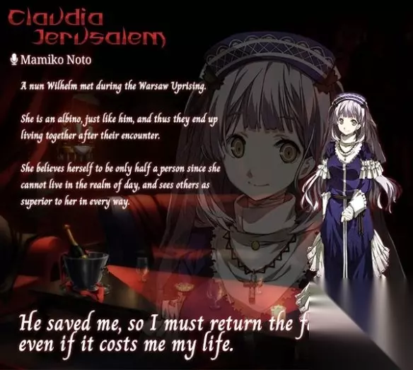 克蕾维缇雅·耶路撒冷 在沙起义战中,与威尔海姆邂逅的修女。 和他一样是白化病,由此两人便开始一同生活。 无法生活在白昼世界的她,将自己定义为只有一半是人类,认为自己的一切 都达不到普通人水准的半调子。 这与其说是自虐,不如说是源自对光明的憧憬的 对他人的过高评价, 对大摇大摆的行走在白昼世界的人们的纯粹憧憬,敬意或是恋慕之情。
