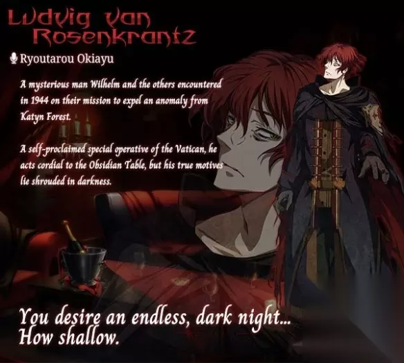路德维希·梵·罗真克莱兹 围绕于1944年在卡廷森林陆续发生的怪异而与威尔海姆邂逅的迷之男子。 自称是梵蒂冈的特殊工作员,对黑圆桌也变现出友好态度,但其真正的目的依然不明。 骑士团副首领卡尔·克莱夫特将他称作玛土撒拉。