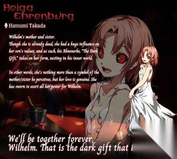 贝露卡·埃雷伯格 威尔海姆的母亲,同时也是姐姐的女性。虽是已故之人,但因为是对威尔海姆的价值观 造成深远影响的存在,所以 圣遗物[暗之赐物] 模拟了贝露卡的姿态,盘踞于威尔海姆的内在。 因此它终究只是威尔海姆认识的母亲亦是姐姐的形象而已,但她所抱有的爱确实货真价值的。 誓言将自己的全部能力都为了威尔海姆而献上。
