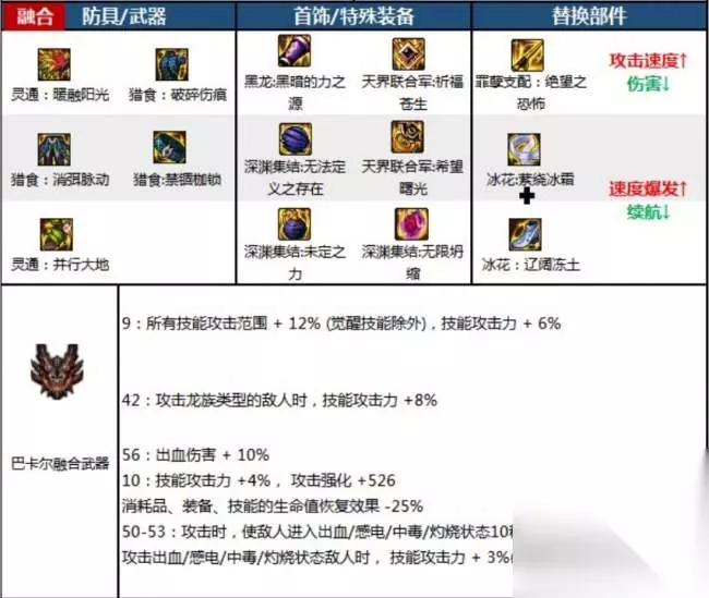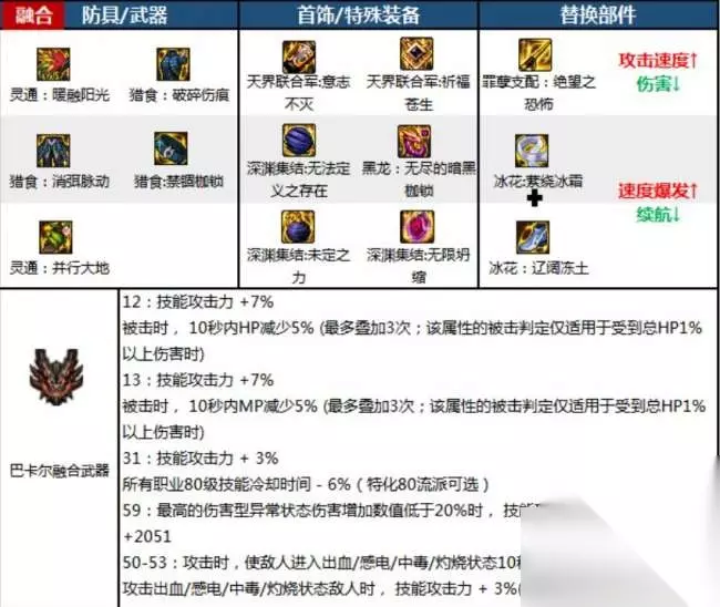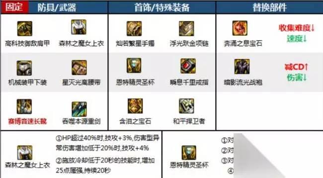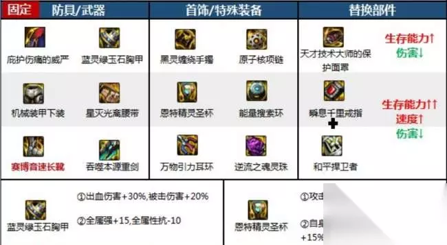 搭配三:攻速自异常流 武器:吞噬本源重剑 防具:高科技肩甲、森林魔女上衣、机械下装、星灭腰带、赛博音速长靴 首饰:灿若繁星手镯、浮光跃金项链、瞬息千里戒指 特殊装备:恩特精灵圣杯、含泪之宝石、和平捍卫者 融合史诗:灵通:暖融阳光、猎食:破碎伤痕、猎食:消弭脉动、猎食:禁锢枷锁、灵通:并行大地 配装特点:这种搭配在保留自己赋予异常状态的装备触发强化效果的同时,能快速对敌人附加异常,在传统自我异常流的基础上,牺牲了一部分坦度换取更高伤害。这种搭配能够让佣兵快速对敌人附加异常状态,提高输出能力,但会牺牲一部分生存能力。