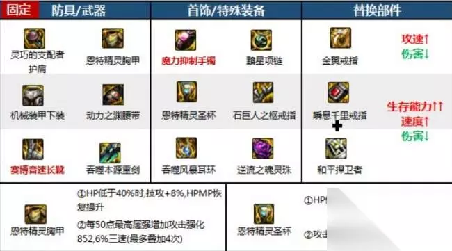 搭配二:攻速空血流 武器:吞噬本源重剑 防具:六方式脉冲肩甲、恩特胸甲、机械下装、动力腰带、赛博长靴 首饰:魔力抑制手镯、黯星项链、石巨人戒指 特殊装备:恩特精灵圣杯、吞噬风暴耳环、逆流灵珠 融合史诗:灵通:暖融阳光、猎食:破碎伤痕、猎食:消弭脉动、猎食:禁锢枷锁、灵通:并行大地 配装特点:这种搭配通过魔力抑制手镯将HP消耗替换为MP,同时搭配赛博音速长靴,在保留空血流大部分生存和恢复能力的情况下获得更高伤害。这种搭配能够在保持佣兵的生存能力的同时,提高其输出能力。