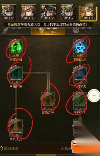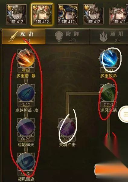 祈祷之舞20 凝魂之术20 卓越护盾10 灵佑之光20 精灵天咒10 灵魂之力10 守护之力20 血舞飞扬10 智弓作为最强辅助角色,各种BUFF技能的额外加成是很重要的,在竞技PK中加攻加防加血,简直是无所不能的存在,进可攻退可守。 防御天赋必须全部先点满,辅助角色重要的不在于输出,而是在于生存,给输出角色增加各种BUFF,扩大输出空间。 加下来再点通用天赋 生命之护20 神装之护20 羽之祝福10 神装减免10 敏法天赋加点攻略
