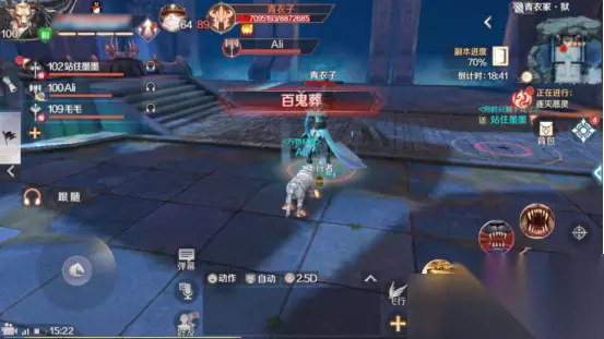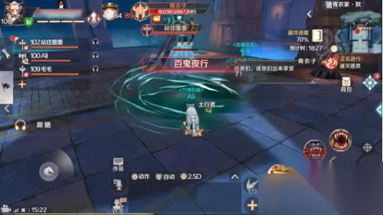 百鬼夜行则是青衣子在附近召唤一群小鬼,小鬼会对我们发起进攻。在青衣子释放此技能时,妖兽使用风火轮对青衣子发起进攻,即可吸引小鬼的仇恨。小鬼比较脆,比较容易消灭。