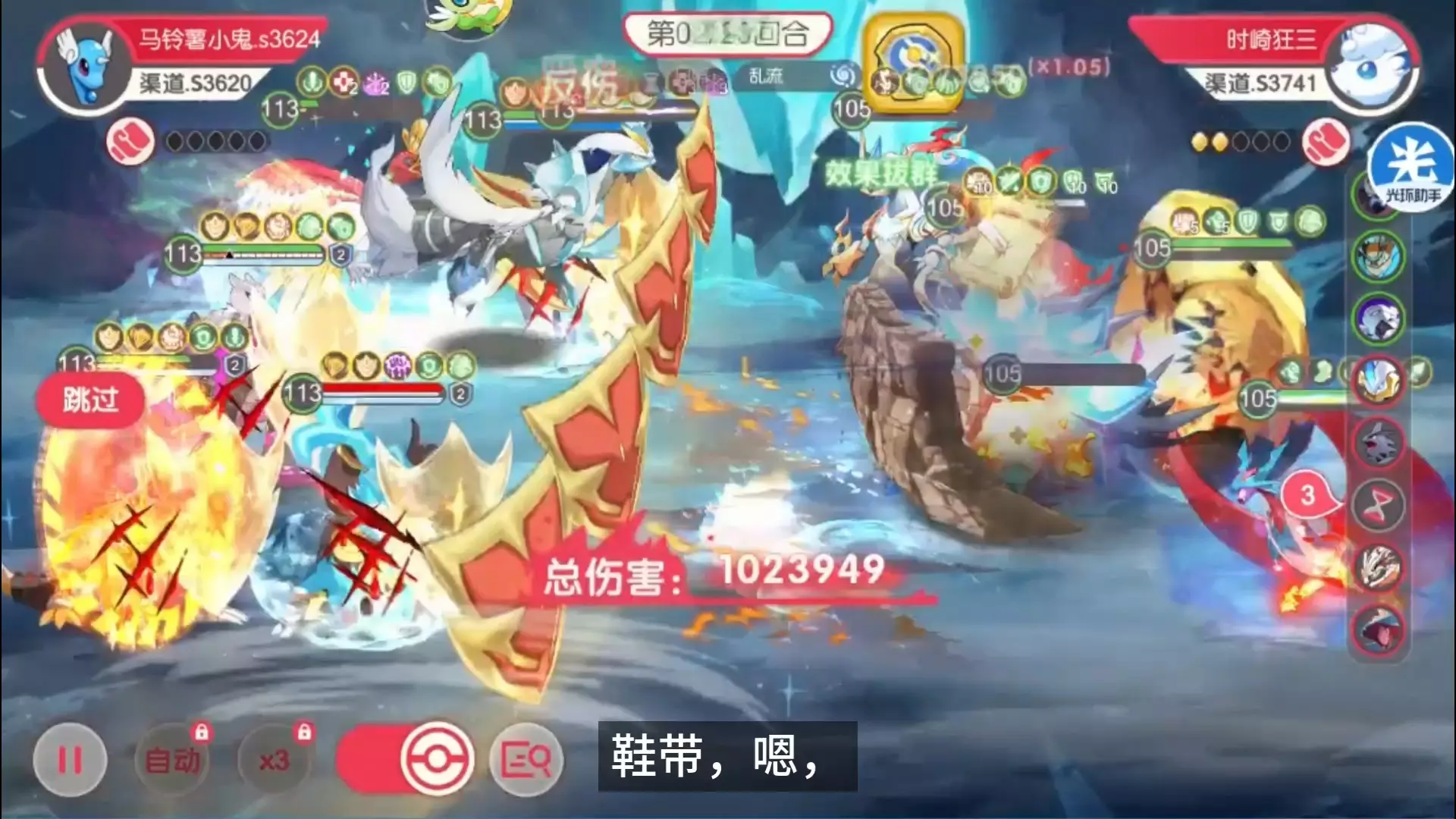 这是《口袋觉醒》的对战内容,玩家在对战中遭遇RPG盾王,选择单挂地龙与之对战,画面呈现了对战中的暴击、吸血等战斗数值,展示了双方的战斗表现。