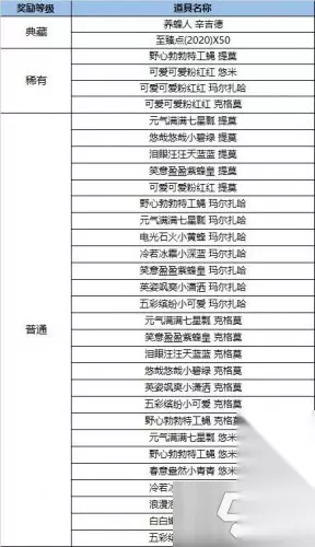 最主要的是,这次小蜜蜂的宝典最后还有31个盲盒,里面有随机奖励,范围涵盖了典藏、稀有或普通三种类别,根据官方的规则以及数据来看,首次开启盲盒会有0.1%概率触发典藏掉落,之后每次都会概率增加,自第21个盲盒起,触发的概率增加0.4%,当玩家开启所有31个盲盒时,必定会触发1次典藏掉落。 典藏奖励只有两项,分别是养蜂人 辛吉德和至臻点(2020)x50,二选一 其他如图: