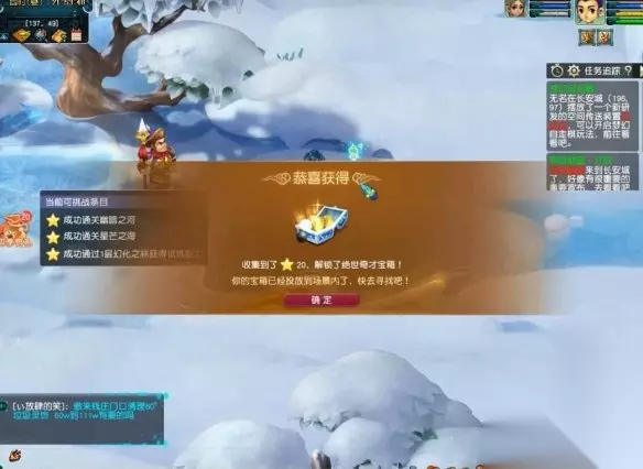 4、再传送到山河画境场景,三个方向,分别对应如梦奇谭任务、神器任务以及天罡地煞任务(每个任务对应的星数也不相同),任选其一完成(可以去幻化之林完成任务获得试炼能力,降低战斗的难度); 5、完成任务后传送到北俱芦洲场景,场景内有泡泡,可以点击获得经验和银两,场景内还可以找到自己的宝箱,最后根据自己的星数就可以获得不同的奖励。