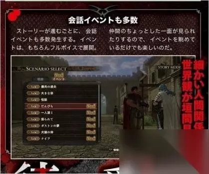 在前往断罪之塔救出卡思嘉的路程中,格斯遇到了以前的朋友格里菲斯。格里菲斯之前为了自己的梦想不惜牺牲整个鹰之团,格斯对格里菲斯非常憎恨,于是他拔出了剑准备攻击格里菲斯,但是这个时候格里菲斯突然从他面前消失了。在旅途中,格斯遇到了以剑士为目标的少年イシドロ,并且成为了伙伴。他们将在路途中遇到新的敌人。 故事模式 1.关卡选择