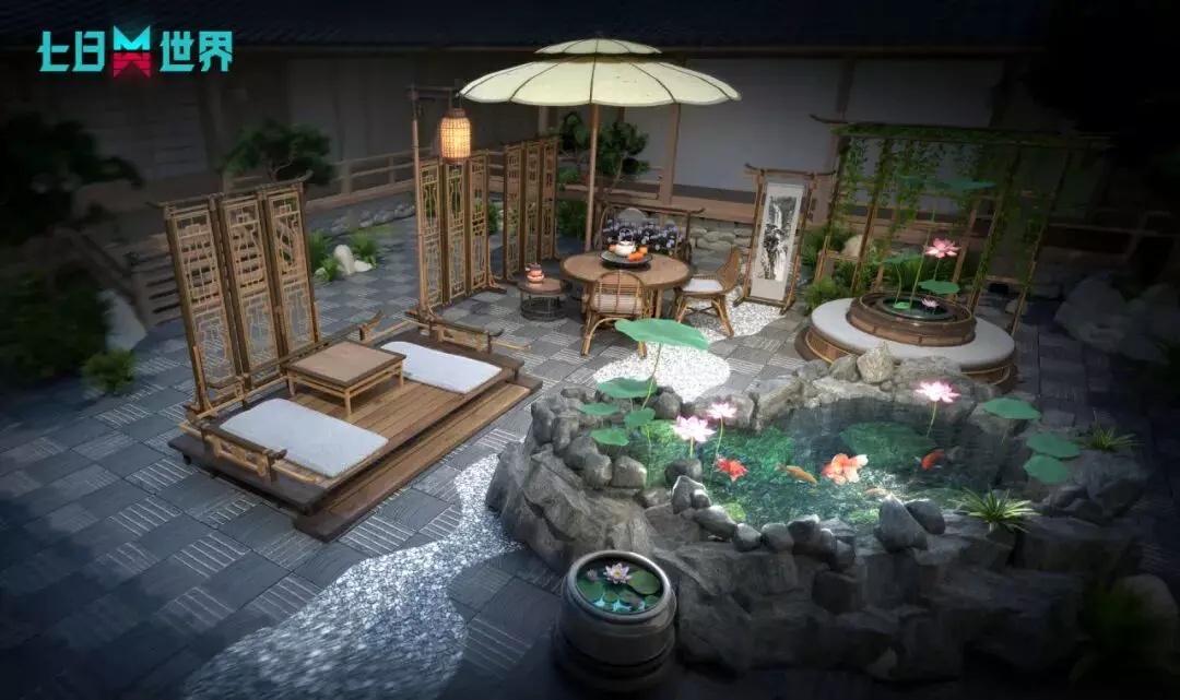 池光如鉴,莲叶田田,池塘中可放入鱼类展示,数尾锦鲤悠游其间,似与观者相乐。轻启院门,便能拥抱治愈秘境,理智与心情,统统回满!