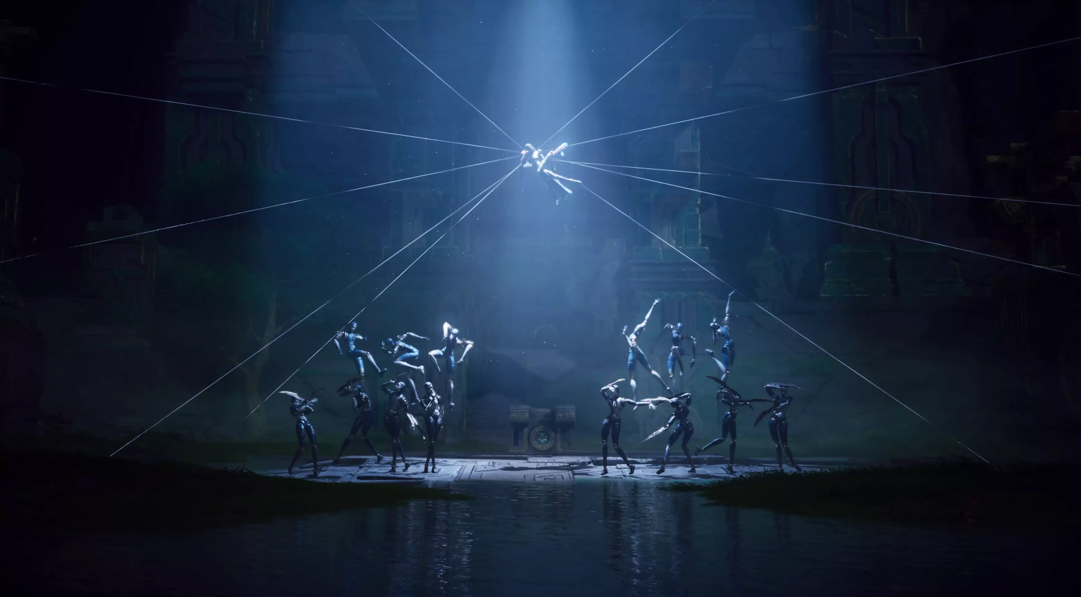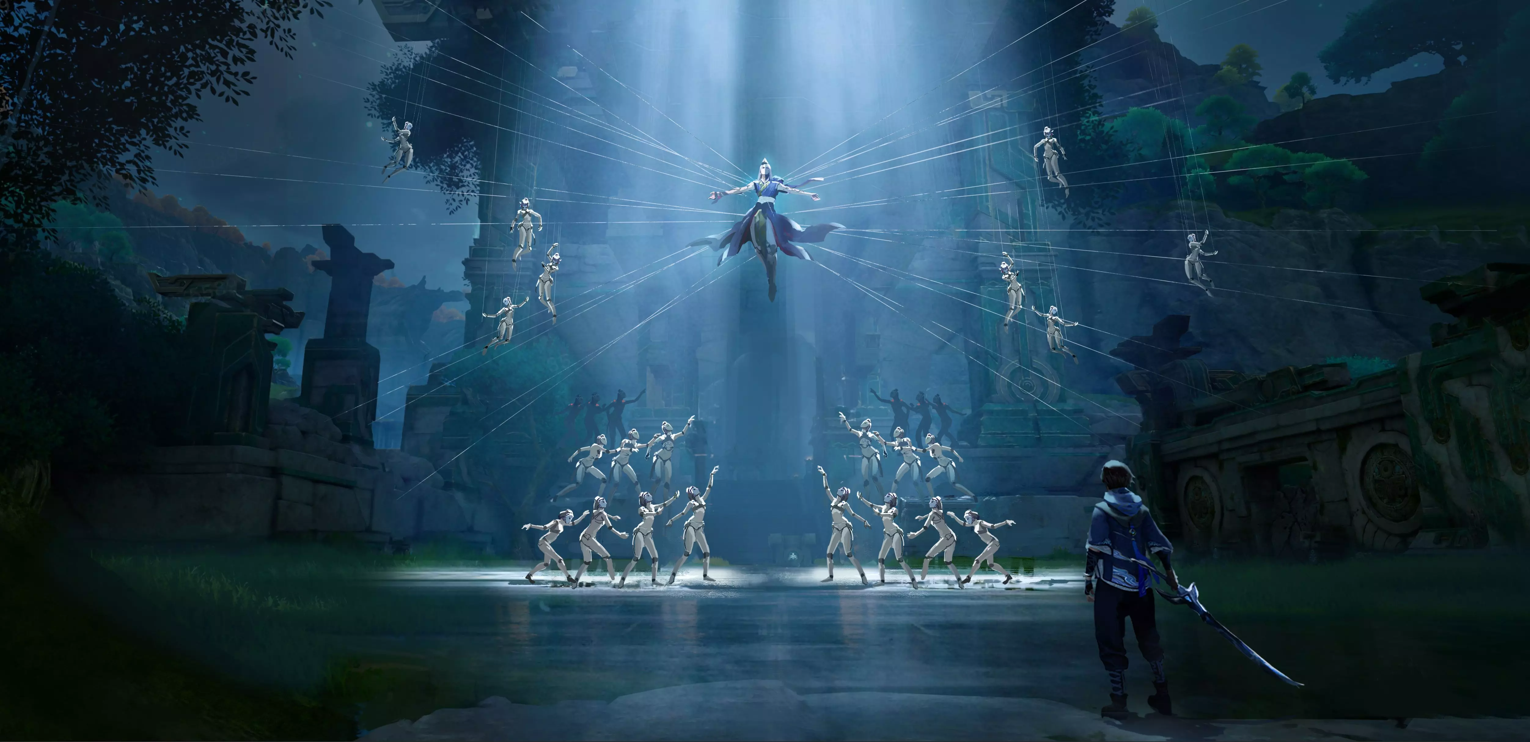 既然是偶戏,首先登场的当然是我们的表演者。这里带给大家一张关于登场表演的原画概念图,从图中我们不难发现主角和配角,我们将中间的大傀儡称为“主舞”,其余的小傀儡我们称为“副舞”。主舞带有更多的元歌色彩,而副舞的作用更多体现在动作造型方面,通过对副舞的动作设计来加强偶戏诡秘和美的氛围。从原画概念图和实机图中能明显看到两张图傀儡的动作是调整过的。(这里留一个小彩蛋等大家去研究啦~)