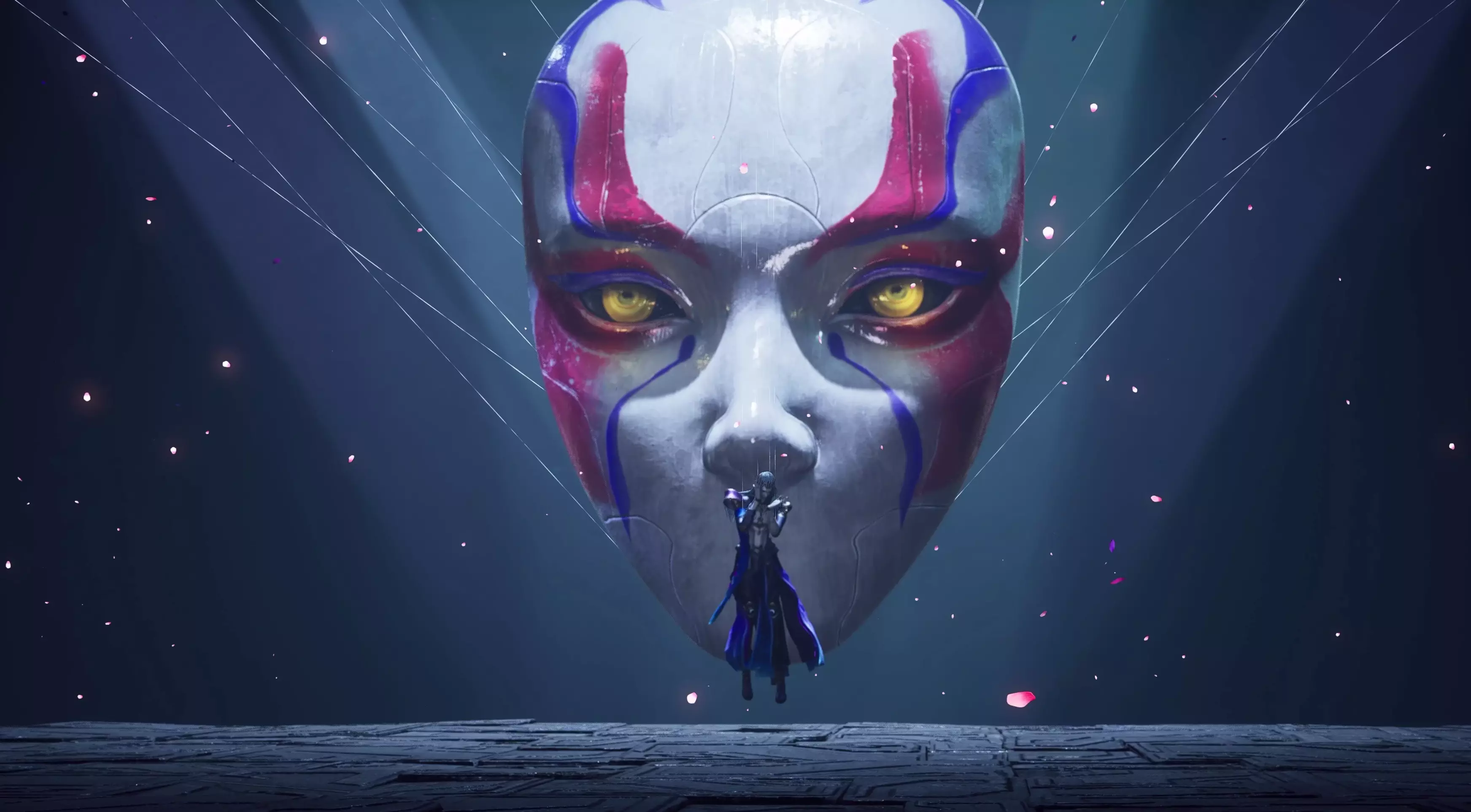 这场BOSS战的剧情部分是元歌傀儡的表演,整个演出是围绕着“偶戏、诡秘、美”为顶层体验去设计。偶戏的体验是来源于元歌对傀儡操控的思考,诡秘和美则更多是对于元歌本身的解读。诡秘是元歌琢磨不透的面具,而美是元歌的理念作为丝线连接每具傀儡。接下来我们将从两个方面“偶戏的舞台氛围、诡秘的面具”来和大家一起走进元歌傀儡的偶戏表演。