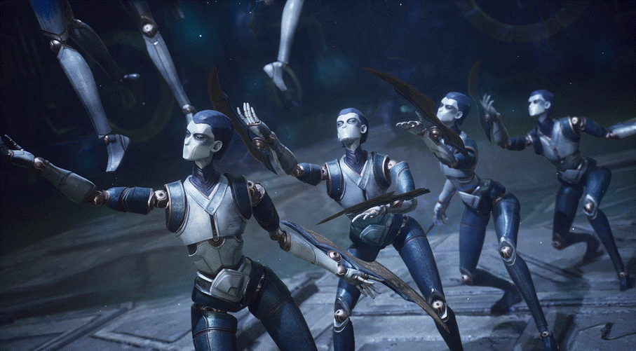 在整个演出的剧情中,我们动画设计的同学成了偶戏的“灯光老师”。首先是确认整场偶戏的灯光氛围基调,为了达到诡秘和美的顶层体验,我们将灯光氛围基调定在了深夜,世界的光照环境设定为阴天大风的夜晚。在确定大世界光照基础后,使用戏剧感强的舞台灯光效果来凸显角色,从而营造诡秘,美和戏剧化的灯光氛围。这种戏剧化的舞台灯光元素,贯穿在多个战斗场景和过场动画灯光中,形成了偶戏独有的视觉元素。接着就是对细节的调整,包括灯光的节奏、金属质感的表现等。为了表现出良好的金属质感,不仅让灯光对角色单独调整了GI,还有环境反射高光,以及大世界灯光和补光对角色的影响,几乎每个镜头都有单独的调整。这是元歌傀儡作为导演对我们的要求,同时我们也非常想做好这出偶戏,希望大家能够喜欢~