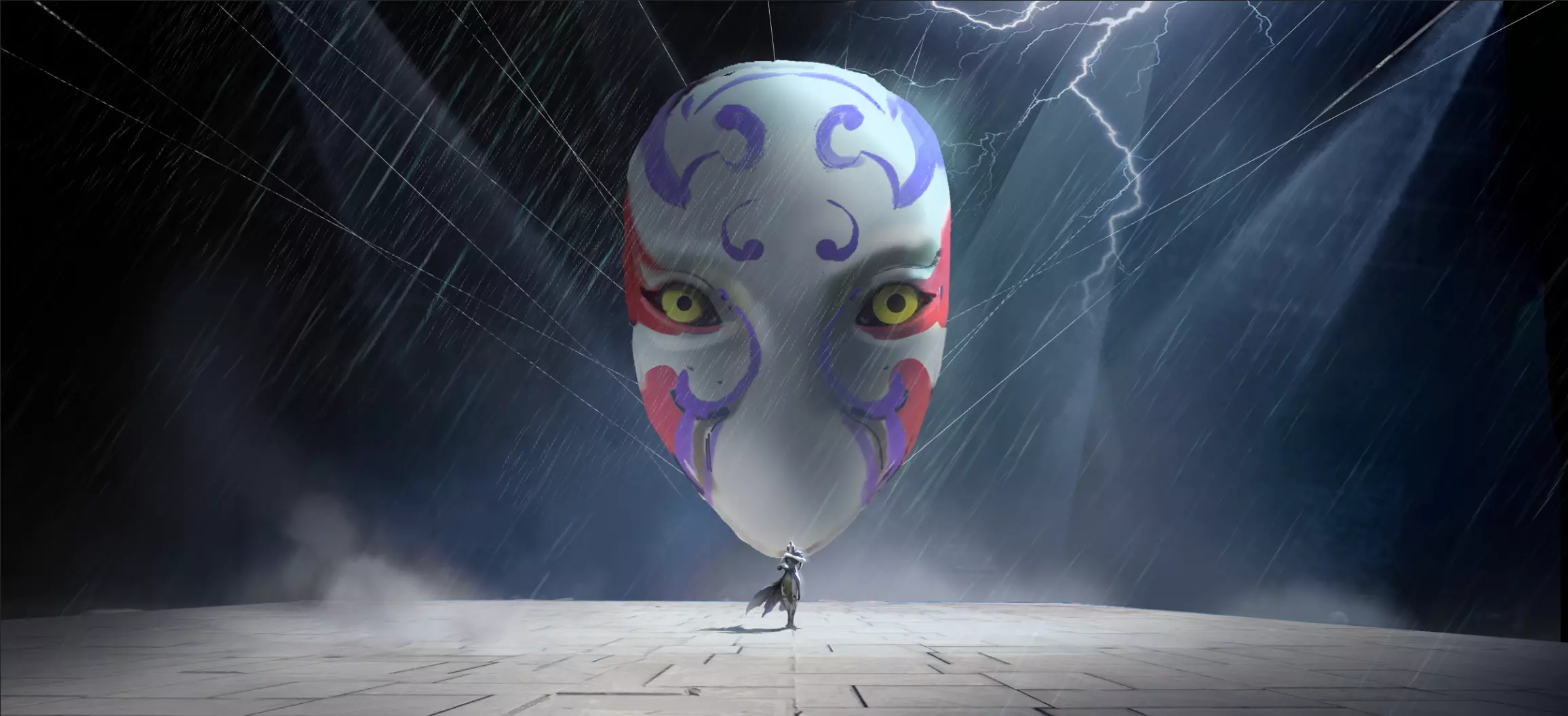 不知道大家对我们视频里面出现的巨大面具还有没有印象,这里也给大家带来了两张原画概念图。从概念图中可以看出我们开始更希望聚焦于面具,在制作过程中我们也首先尝试了还原概念图的设计。但其实我们对于面具的定位更多是元歌傀儡的伪装,聚焦于面具反而让后面元歌傀儡的表演没有发挥的空间。于是我们把演出的主体重新定位到元歌傀儡,而对面具的定位更多是作为偶戏中的置景道具,通过置景道具来传达元歌傀儡的心理映射。偶戏主体是元歌傀儡,面具则是作为客体去点缀氛围。