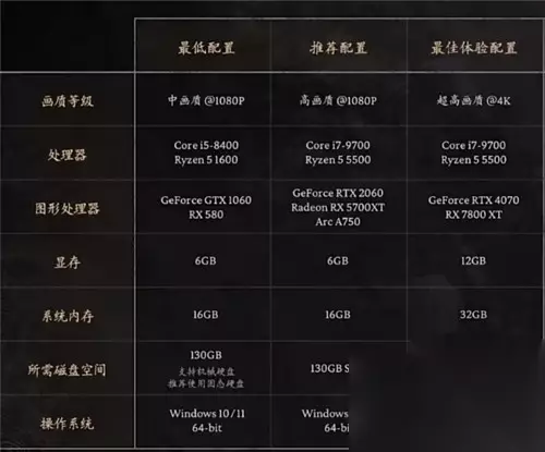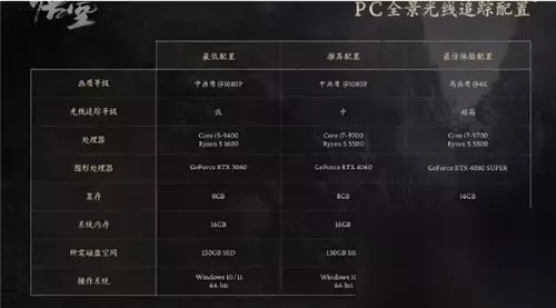 黑神话悟空主机端配置要求是什么 答:分为1080p和全景光线追踪。 1080P最低配置 需要64位处理器和操作系统; 操作系统:windows 10 64-bit; 处理器:intel core i5-8400/amd ryzen 5 1600; 内存:16GB ram; 显卡:nvidia geforce gtx 1060 6gb/amd radeon rx 580 8gb; directx 版本:11; 存储空间:需要130gb可用空间; 声卡:兼容 windows 的音频设备; 附注事项:支持机械硬盘(hdd),推荐使用固态硬盘(ssd)。以上配置均在启用 dlss/fsr/xess 技术的情况下进行测试。 1080P推荐配置 需要64位处理器和操作系统; 操作系统:windows 10 64-bit; 处理器:intel core i7-9700/amd ryzen 5 5500; 内存:16GB ram; 显卡:nvidia geforce rtx 2060/amd radeon rx 5700xt/intel arc a750; directx 版本:12; 存储空间:需要130gb可用空间; 声卡:兼容 windows 的音频设备; 附注事项:需要使用固态硬盘(ssd)。以上配置均在启用 dlss/fsr/xess 技术的情况下进行测试。 全景光线追踪最低配置(中画质1080p低光追): 需要64位处理器和操作系统; 操作系统:windows 10 64-bit; 处理器:intel core i5-9400/amd ryzen 5 1600; 内存:16GB ram; 显卡:nvidia geforce rtx 3060 8gb; 存储空间:需要130gb 固态硬盘空间。 全景光线追踪推荐配置(中画质1080p中光追): 需要64位处理器和操作系统; 操作系统:windows 10 64-bit; 处理器:intel core i7-9700/amd ryzen 5 5500; 内存:16GB ram; 显卡:nvidia geforce rtx 4060 8gb; 存储空间:需要130gb 固态硬盘空间。 全景光线追踪最佳配置(高画质4k 超高光追): 需要64位处理器和操作系统; 操作系统:windows 10 64-bit; 处理器:intel core i7-9700/amd ryzen 5 5500; 内存:32GB ram; 显卡:nvidia geforce rtx 4080 super 16gb; 存储空间:需要130gb 固态硬盘空间。 一、电脑端全景光线追踪配置 最佳画质(4k/2k): 处理器:Core i7-9700、Ryzen 5 5500 图像处理器:GeForce RTX 4080 SUPER 显存:16GB 系统内存:32GB 所需磁盘空间:130GB SSD 操作系统:windonws 10/11 64 bit 中画质推荐(1080P): 图像处理器:GeForce RTX 4060 显存:16GB 系统内存:16GB 低画质推荐(1080P): 图像处理器:GeForce RTX 3060 PC全景光线追踪配置图: