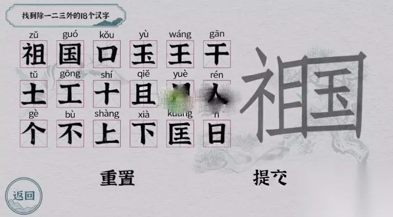 一字一句祖国找到18个汉字怎么过?这一关的题目由祖国两个字组成,大家要从中找到一、二、三以外的汉字。下面小编就为大家带来了《一字一句》祖国找到18个汉字通关攻略,感兴趣的小伙伴们一起来看看吧,希望能对大家有所帮助。