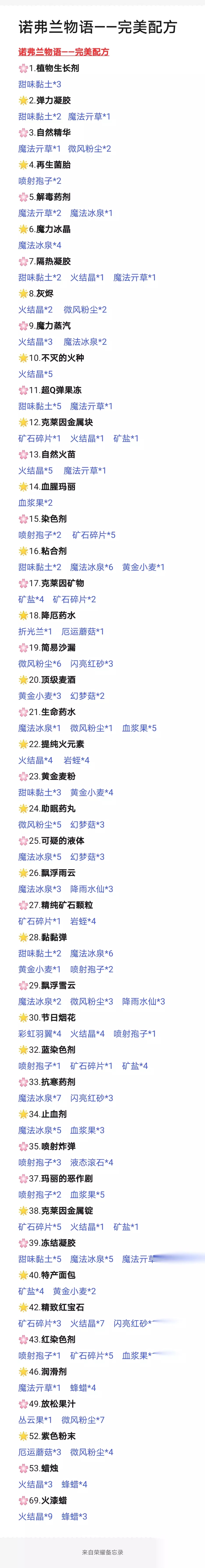诺弗兰物语活动配方有哪些?诺弗兰物语游戏是一款养成经营类,游戏主要是通过搜寻原材料制作不一样的物品,找到配方便可做成,本次活动的配方有哪些?还不知情的小伙伴赶紧来瞧瞧,说不定有你需要的配方哟。 诺弗兰物语活动配方图鉴 1.粘合剂 甜味粘土(少量)+魔法冰泉(少量)+增生土块(大量) 2.催产肥料 甜味粘土(少量)+魔法冰泉(少量)+魔法亓草(少量)+增生土块(大量) 3.快凝修补液 甜味粘土(少量)+魔法冰泉(少量)+火结晶(少量)+增生土块(大量) 4.压缩食物 甜味粘土(少量)+魔法冰泉(少量)+海沟海蜇(大量) 5.快愈药膏 甜味粘土(少量)+魔法冰泉(少量)+微风粉尘(少量)+月光石(大量) 6.魔力定标器 甜味粘土(少量)+魔法亓草(少量)+微风粉尘(少量)+月光石(大量) 7.魔法地图 火结晶(少量)+微风粉尘(少量)+家族残徽(大量) 8.不老羊皮卷 魔法亓草(少量)+火结晶(少量)+微风粉尘(少量)+家族残徽(大量) 9.混沌理念 甜味粘土(少量)+魔法冰泉(少量)+火结晶(少量)+微风粉尘(少量)+冰髓(大量) 10.坚韧绳索 魔法亓草(少量)+微风粉尘(少量)+冰髓(大量) 11.收纳宝石 微风粉尘(少量)+魔法冰泉(少量)+魔法亓草(少量)+不老冰(大量) 12.领航罗盘 甜味粘土(少量)+魔法冰泉(少量)+魔法亓草(少量)+微风粉尘(少量)+不老冰(大量) 诺弗兰物语活动配方有哪些的内容就是这样了,希望能帮到小伙伴们,欢迎小伙伴们浏览本站的其他游戏攻略!同时也欢迎小伙伴们收藏以便实时关注最新的游戏攻略!