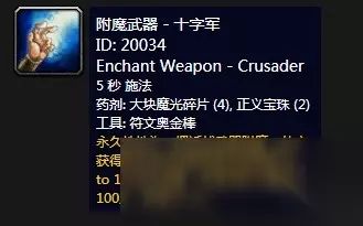 魔兽世界怀旧服附魔武器-十字军 效果:永久性地为一把近战武器附魔,使它获得在攻击时经常性地为你回复75 to 126点生命值,并使你的力量提高100点,持续15 sec。 工具:符文奥金棒 需要素材:大块魔光碎片x4、正义宝珠x2 学习等级:大师级附魔300 学习自:由公式:附魔武器-十字军图纸学习,图纸由西瘟疫之地的血色缚法者和血色大法师掉落,掉率0.75%。
