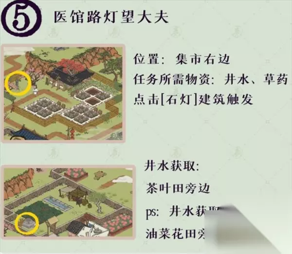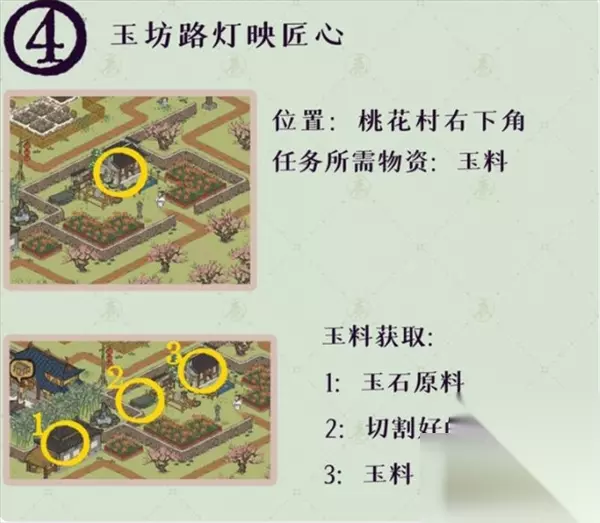 任务所需物资:玉料 任务所需物资:井水、草药 位置:见下图